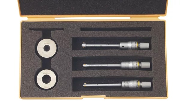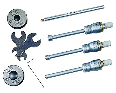 The Mitutoyo 368-916 Holtest three-point micrometer set has TiN-coated points, a measurement range of 0.275-0.5”, and is precise to 0.0001”, with + or – 0.0001” of accuracy. Titanium nitride (TiN)-coated measuring contact points offer durability and impact resistance, while contact point geometry allows the instrument to measure to the bottom of a blind hole. The ratchet stop offers constant force for repeatability. Includes inspection certificate ensuring that the exact micrometer purchased has met National Institute of Standards and Technology master standards. This gage set includes three complete display units, two setting rings, extension rod, and a fitted plastic case.