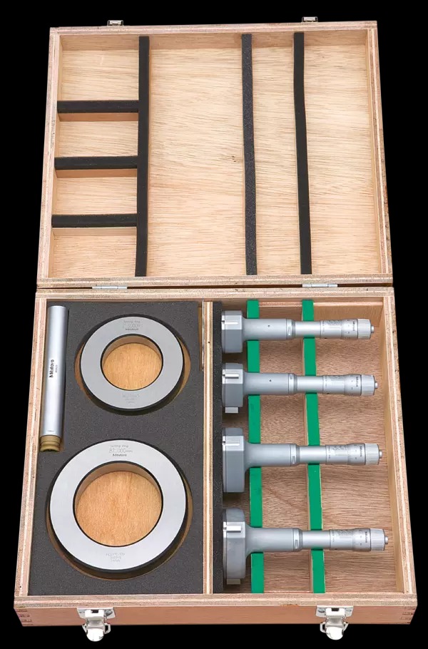 The Mitutoyo 368-993 Holtest (Type II) Three Point Internal Micrometer set includes the following:
