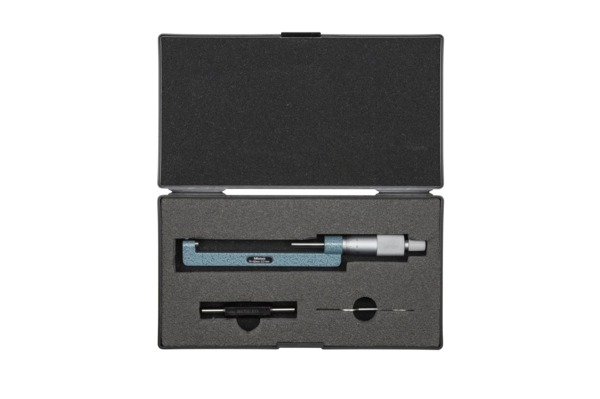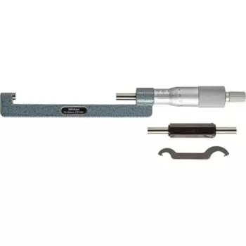 The Mitutoyo 147-304 hub micrometer is designed for precise measurements of hub thickness and shoulder inside a bore. The Mitutoyo hub micrometer features high-grade hardened steel on its frame, spindle and anvil to deliver precise, repeatable thickness and shoulder measurements. The micrometer’s ratchet-stop mechanism provides uniform pressure on a workpiece for precise, repeatable measurements. An inch Vernier scale provides outside diameter measurements.