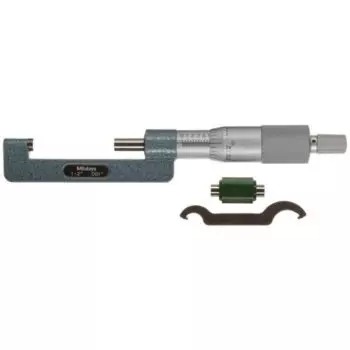 The Mitutoyo 147-352 hub micrometer is designed for precise measurements of hub thickness and shoulder inside a bore. The Mitutoyo hub micrometer features high-grade hardened steel on its frame, spindle and anvil to deliver precise, repeatable thickness and shoulder measurements. The micrometer’s ratchet-stop mechanism provides uniform pressure on a workpiece for precise, repeatable measurements. An inch Vernier scale provides outside diameter measurements.