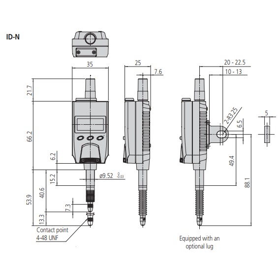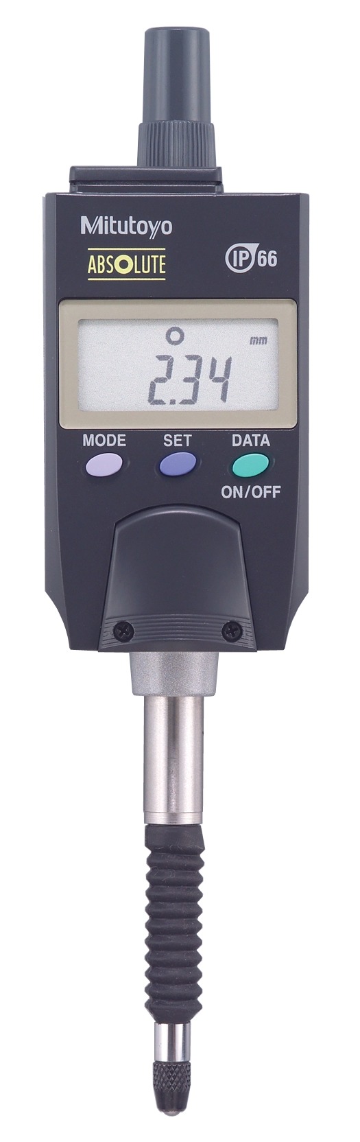 The Mitutoyo ABSOLUTE Digimatic ID-N series indicator is ideal for accurately measuring short, linear distances in tight spaces and harsh workshop conditions. Measurements are shown on a rotatable LCD display. The Mitutoyo ABS ID-N Series digital indicator features a slim body that rotates up to 180 degrees for taking measurements from different directions. The 35mm-wide body provides measurements in tight, restricted spaces where standard gage graduations are difficult to read. The ID-N indicator measures linear distances up to 5mm (metric only) or 12.7mm/.5” (Inch/Metric model), and some models have a selectable resolution and accuracy of up to +/- .00012″/.003mm.