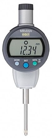 Additional functions for this indicator include origin set, preset, zero set, counting direction switching, and alerts for low voltage, counting value composition, overflow, and tolerance limit setting errors. The measuring force is 1.8 Newtons (N) or less. It has a battery life of approximately 7,000 hours of normal use. This unit comes with a SR-44 battery and lifting lever. This gauge offers serial data output (using optional SPC cables, sold separately), which increases speed and reliability of digital measurement records.