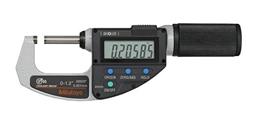 The Mitutoyo QuickMike digital micrometer has a fast spindle feed which allows various shapes to be measured quickly. The Mitutoyo Digimatic QuickMike coolant proof digital micrometer feeds the spindle 10mm per thimble rotation, or 20-times faster than standard micrometers. This speed provides quicker measurements on different sized features. The wide measuring range on the Mitutoyo 293-676-20 allows for measuring of different workpieces without sacrificing speed or accuracy.