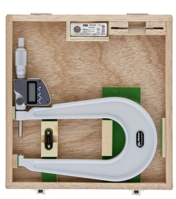 The Mitutoyo 389-252-30 Digimatic sheet metal micrometer is designed with a deep measuring throat to enable multiple measurements across a linear plane on materials such as sheet metal, paper, plastic and rubber. This micrometer has an IP65 dust and water protection level. The Mitutoyo digital sheet metal micrometer is available with a 6-inch or 12-inch throat, allowing the user to take measurements in the middle of sheets of metal, plastic, rubber and paper with high accuracy. Readings are displayed on an easy-to-read LCD readout with accessible function buttons. The coolant-proof micrometer’s ratchet thimble mechanism provides a constant measuring force on the spindle to ensure accurate, repeatable measurements.