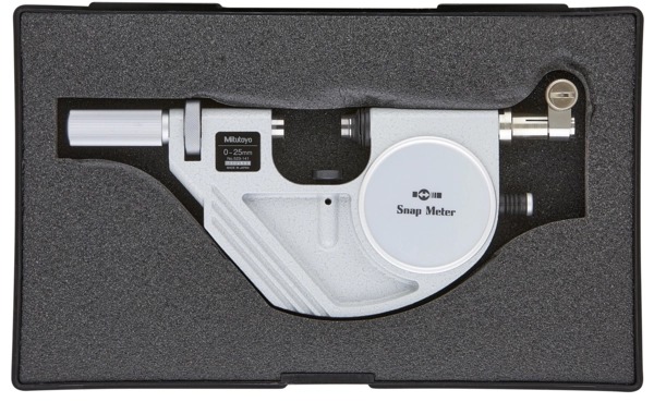 The Mitutoyo 523-141 snap meters accept a variety of optional indicators, linear gages and LVDTs for fast, accurate outside dimension verification according to a preset dimension or tolerance. The Mitutoyo snap meter gage utilizes a hardened steel spindle and anvil with carbide faces for precise, highly reliable outside dimension measurements. Many different types of dial or digital indicators attach to the spindle, allowing for GO/NG measurements on a wide variety of applications.Majority of the users will use an electronic indicator on the snap meter but a high accuracy probe or LVDT hooked up to a digital readout can increase the overall accuracy of the snap meter.hen an electronic indictor includes tolerancing lights in the features, the Mitutoyo Snap Meter can turn into an easy-to-use Go/NG gauge. The anvil trigger has a balanced spring and operates easily with a button on the anvil side of the frame. The retractable anvil allows for faster workpiece throughput without sacrificing accuracy.