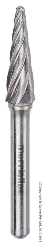 • Precision CNC machined brazed burr. • The Non-ferrous or Fast Mill burrs feature a specialised helical cutting geometry optimised for rapid stock removal on softer non-ferrous materials such as plastics or aluminium. Head Dia: 3/8” Head Length: 1 3/16” Overall Length: 3”