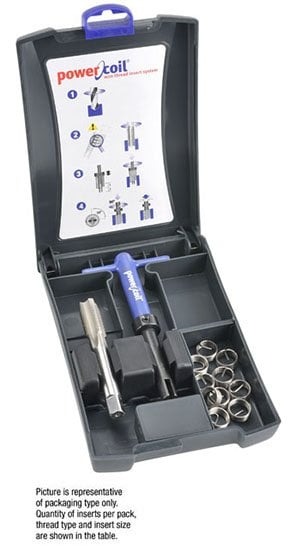 PowerCoil kits contain the wire thread inserts, tap, installation tool, and, in many cases, the tapping drill and break off tool needed for particular sizes of PowerCoil insert.