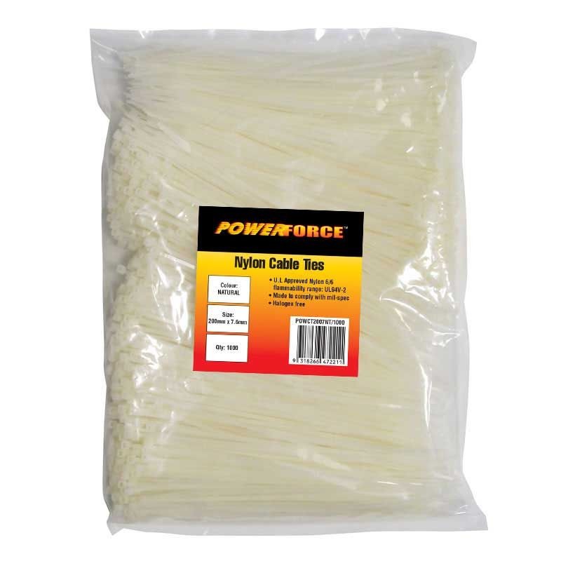 Home » Shop » HAND TOOLS » POWERFORCE – CABLE TIE, NYLON – NATURAL 200mm x 7.6mm [1000] PACK