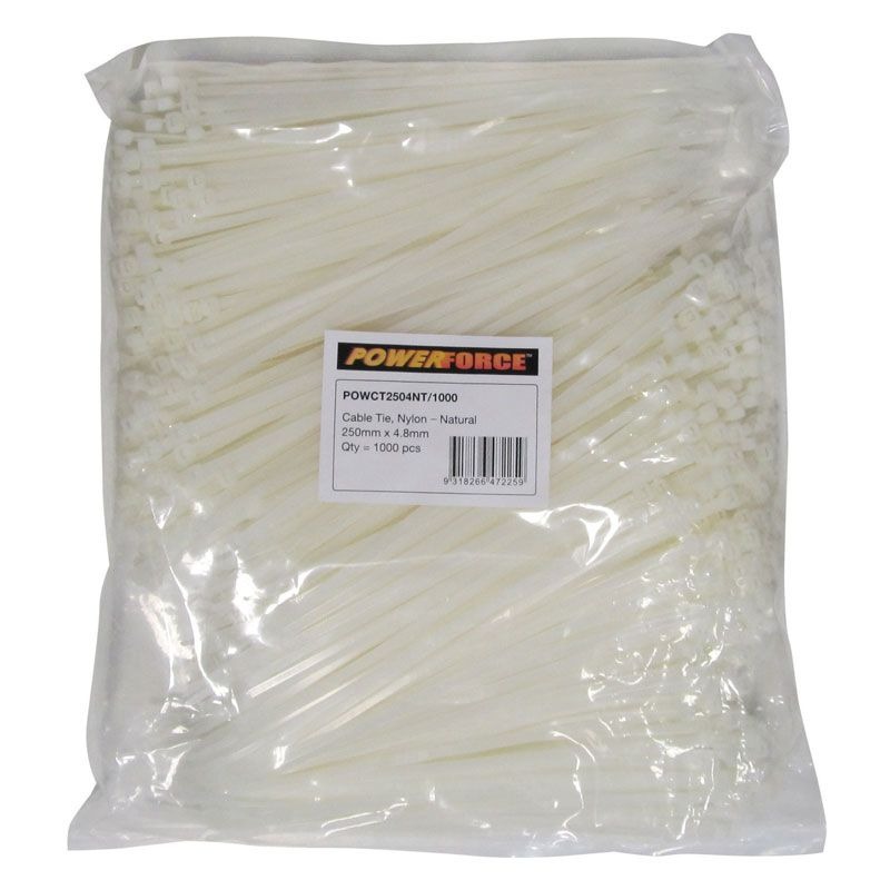 Home » Shop » HAND TOOLS » POWERFORCE – CABLE TIE, NYLON – NATURAL 250mm x 4.8mm [1000] PACK