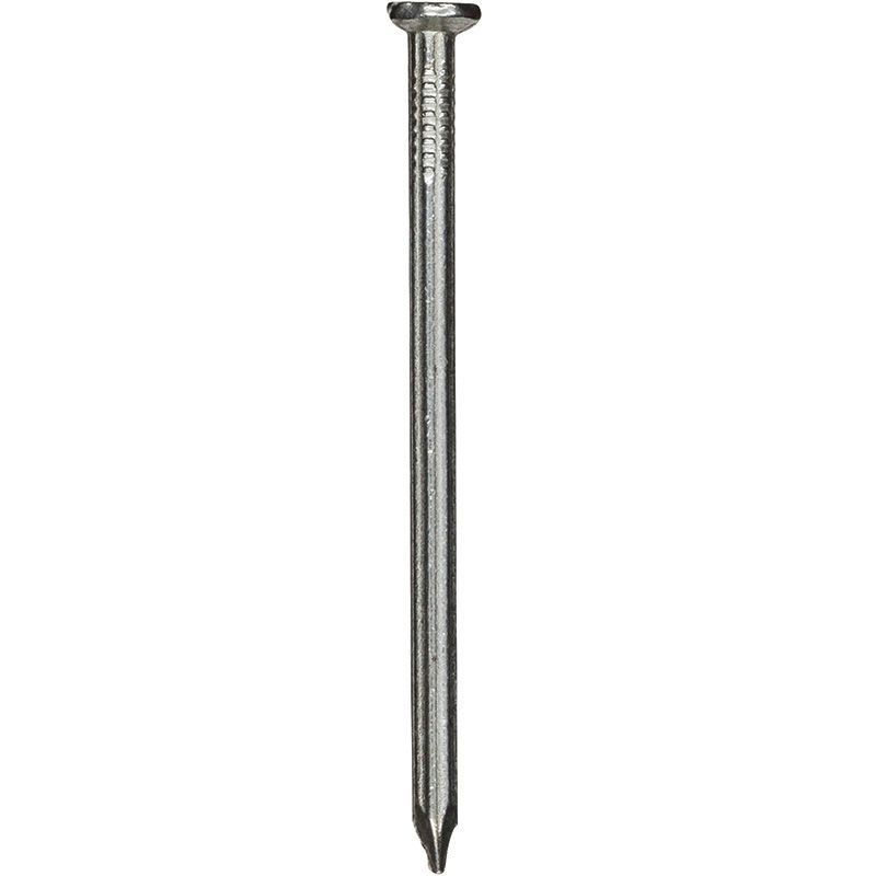 Masonry nail suitable for hammer fastening into concrete, light weight concrete and hollow core block.
