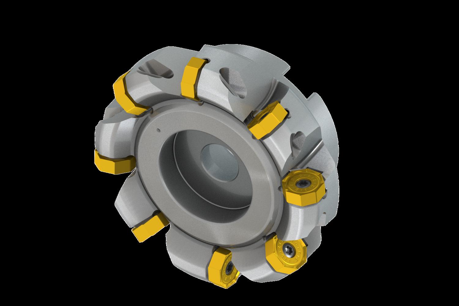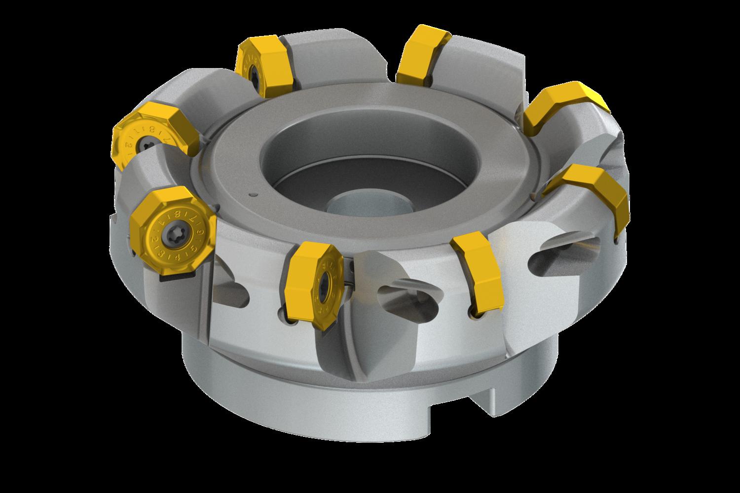 Face mill with double negative geometry which utilises 8 of ONMX 0605.., ONMX 0605..-W or SNMX 1705.. double-sided inserts, cutting diameter 100mm to maximum 110.8mm with 43° approach angle and 32mm connection bore according to DIN 8030-A, 50mm functional and, through coolant and differential pitch for face milling and chamfering with a maximum depth of cut of ON.. 4mm, SN.. 7mm