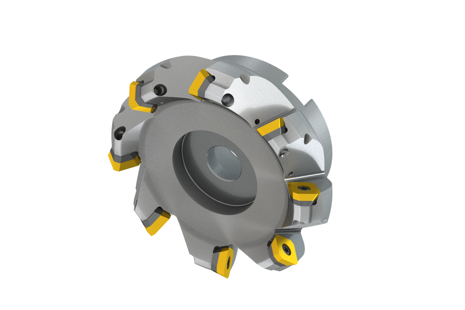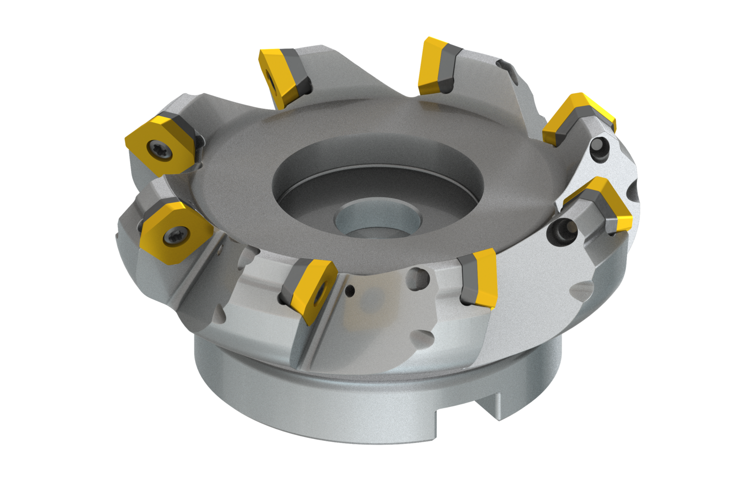 Face mill with positve/negative geometry which utilises 8 of SDET 13T3.., SDMT 13T3.. or XDET 13T3.. single-sided inserts, cutting diameter 100mm to maximum 112.9mm with 45° approach angle and 32mm connection bore according to DIN 8030-A, 50mm functional and, through coolant and differential pitch for face milling and chamfering with a maximum depth of cut of 6.4mm