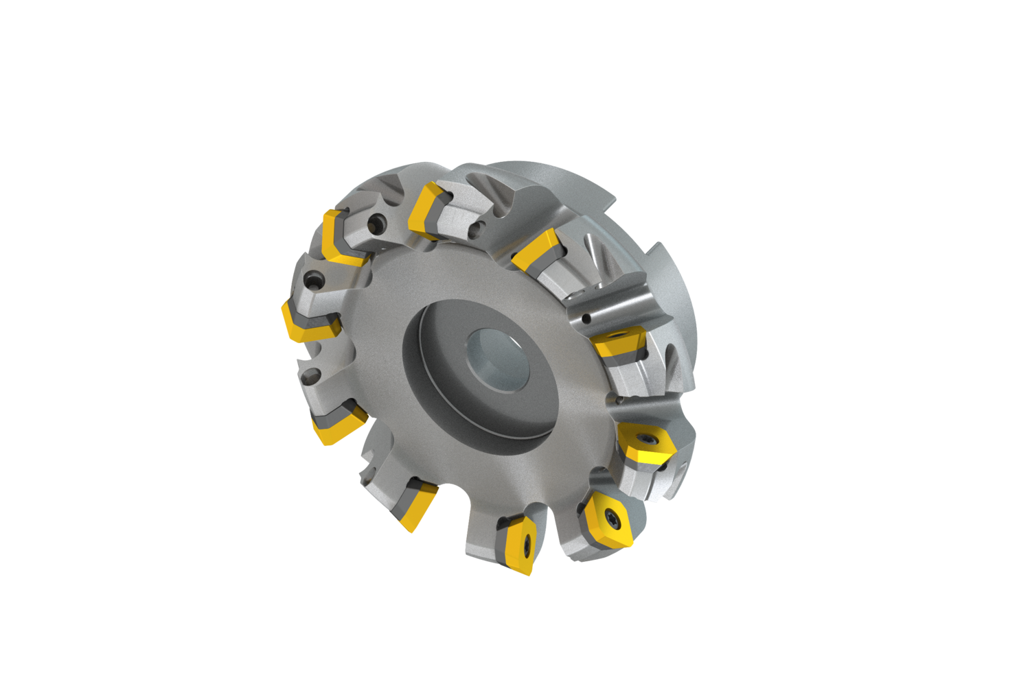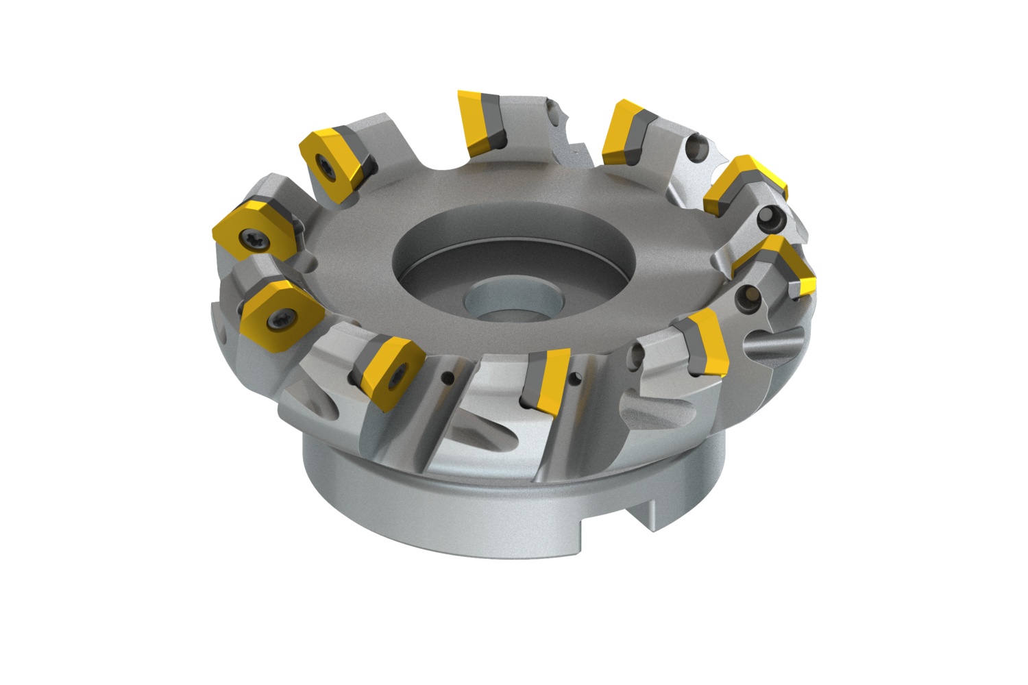 Face mill with positve/negative geometry which utilises 10 of SDET 13T3.., SDMT 13T3.. or XDET 13T3.. single-sided inserts, cutting diameter 100mm to maximum 112.9mm with 45° approach angle and 32mm connection bore according to DIN 8030-A, 50mm functional and, through coolant for face milling and chamfering with a maximum depth of cut of 6.4mm