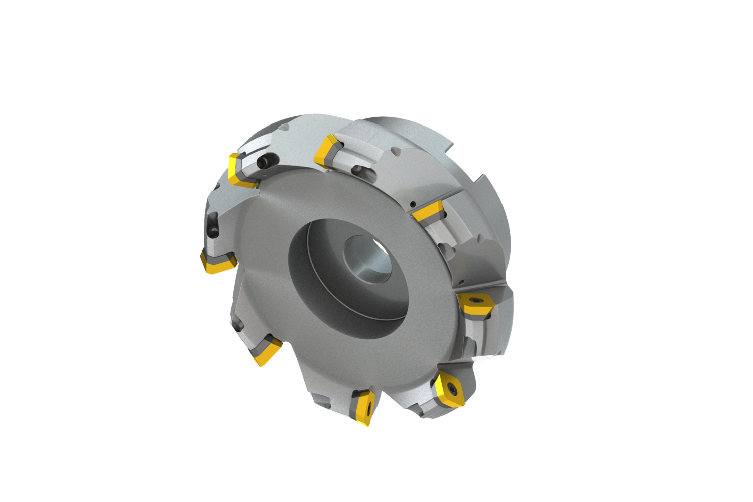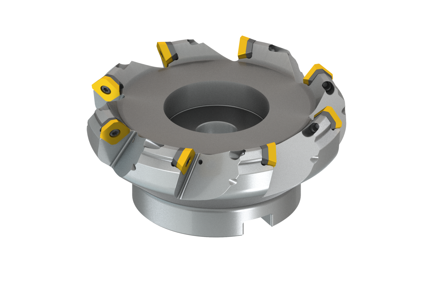 Face mill with positve/negative geometry which utilises 8 of SDET 13T3.., SDMT 13T3.. or XDET 13T3.. single-sided inserts, cutting diameter 125mm to maximum 137.8mm with 45° approach angle and 40mm connection bore according to DIN 8030-A, 63mm functional and, through coolant and differential pitch for face milling and chamfering with a maximum depth of cut of 6.4mm