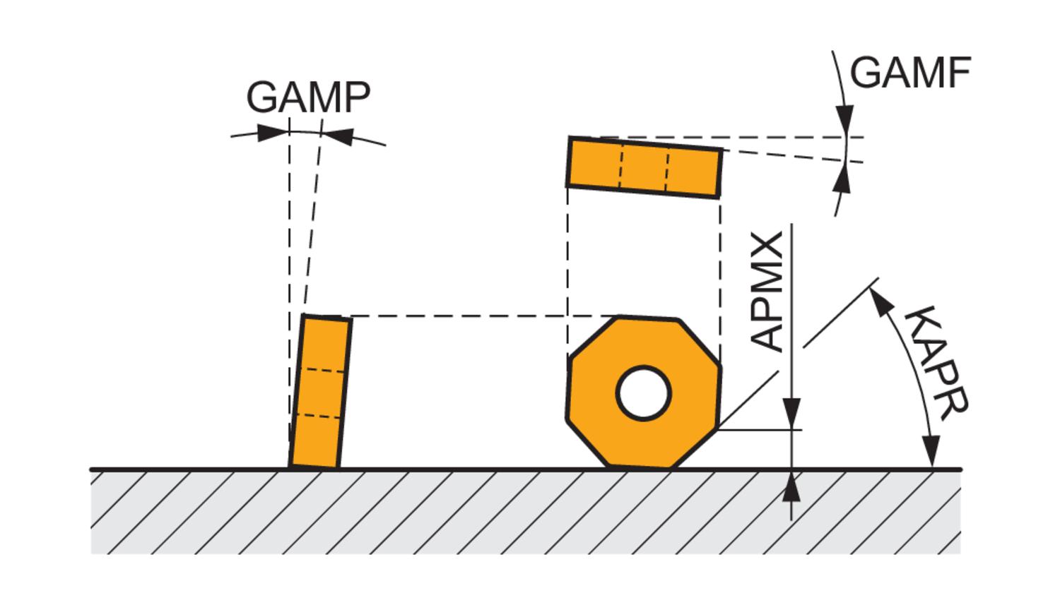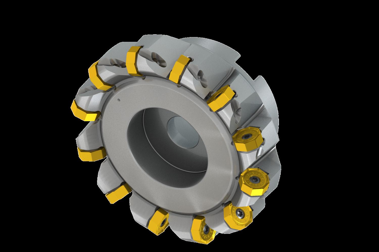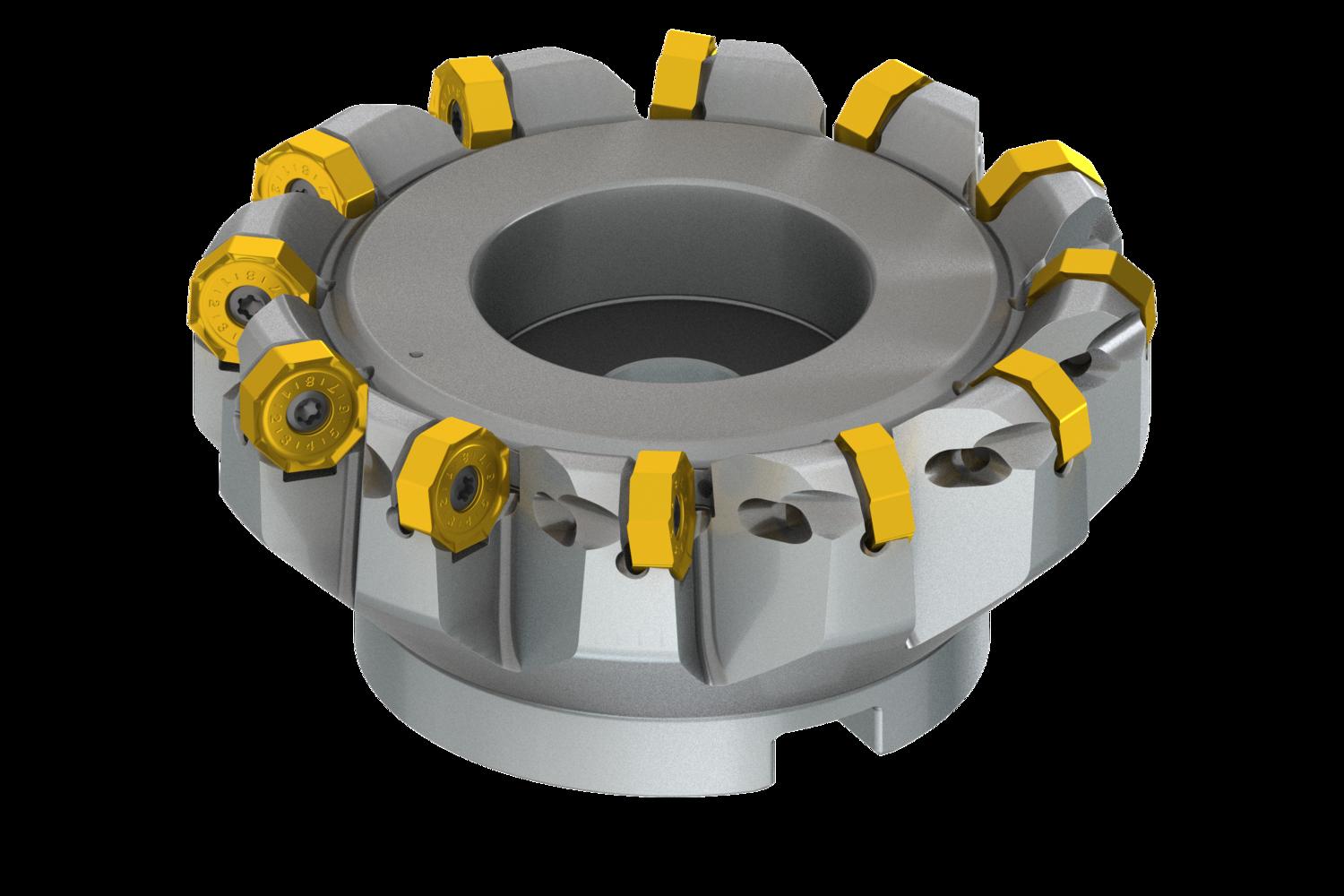 Face mill with double negative geometry which utilises 12 of ONMX 0605.., ONMX 0605..-W or SNMX 1705.. double-sided inserts, cutting diameter 125mm to maximum 135.8mm with 43° approach angle and 40mm connection bore according to DIN 8030-A, 63mm functional and, through coolant for face milling and chamfering with a maximum depth of cut of ON.. 4mm, SN.. 7mm