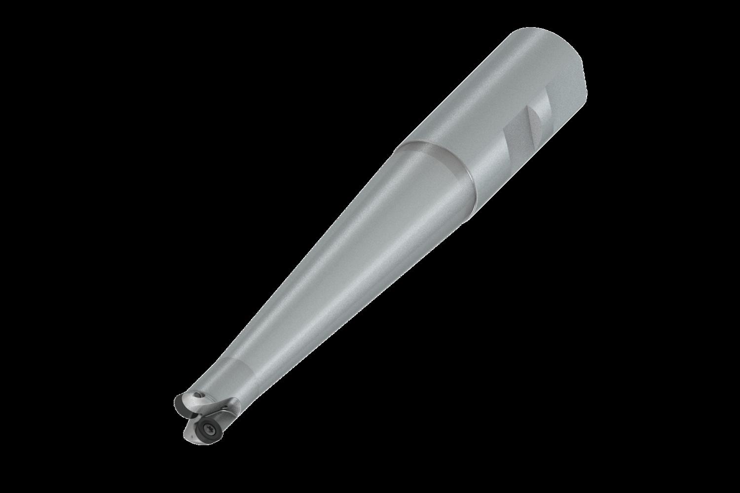 Copy face mill with positve/negative geometry which utilises 2 of RD.. 0702MO.. or RD.. 07T1MO.. single-sided inserts, cutting diameter to maximum 15mm with 25mm Weldon shank according to DIN 1835B, 120mm usable and 176mm overall length, through coolant for face milling, copy milling, ramping, progressive plunge milling and helical milling with a maximum depth of cut of 2mm