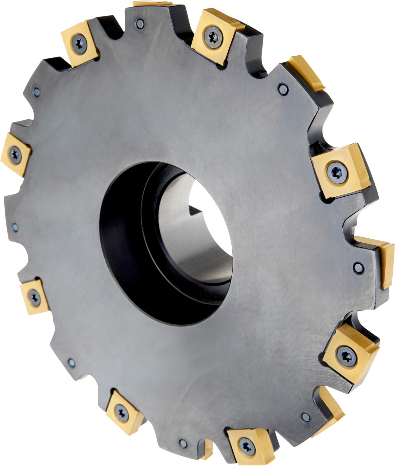 Disc mill with positve/negative geometry which utilises 16 of SNHQ 1205.. double-sided inserts, cutting diameter 160mm with 90° approach angle and 40mm connection bore according to DIN 8030-B, 50mm protrusion length for deep slot milling with a width of cut of 10mm