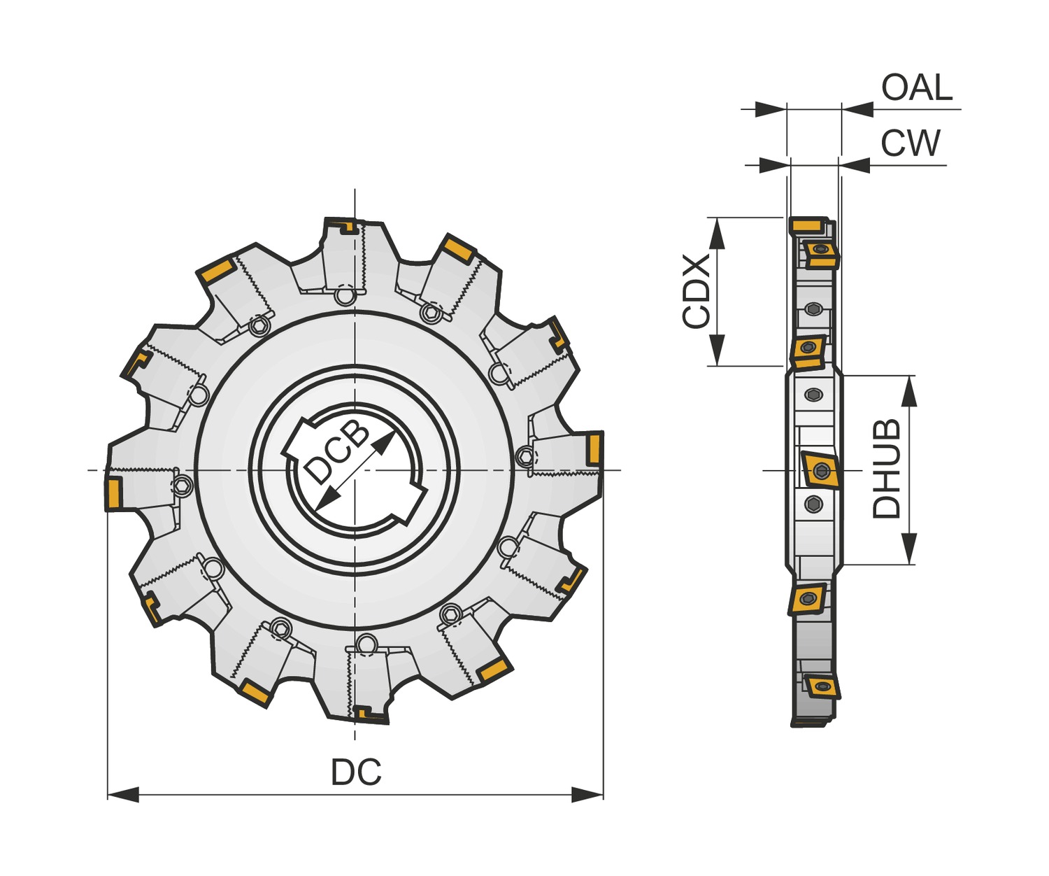 Disc mill with positve/negative geometry which utilises 12 of CNHQ 1005.. double-sided inserts, cutting diameter 160mm with 90° approach angle and 40mm connection bore according to DIN 8030, for deep slot milling with a width of cut of 14,0 ÷ 18,5mm