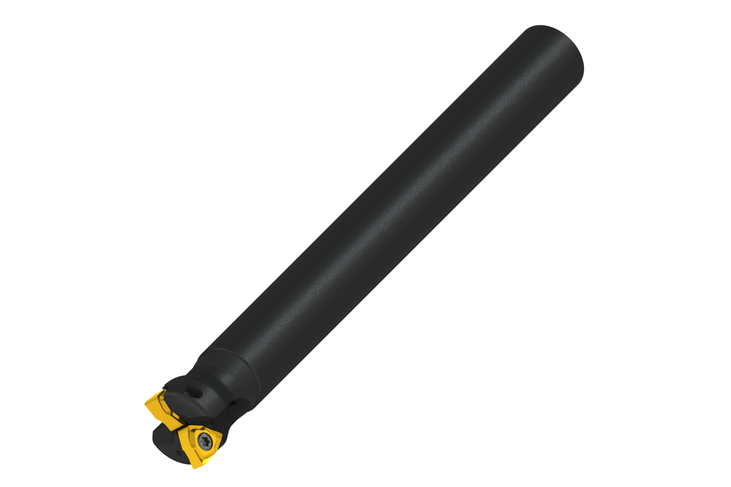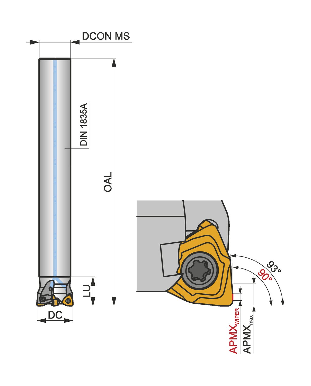 Copy face mill with double negative geometry which utilises 2 of WNHX0403.. double-sided inserts, cutting diameter 16mm with 90° approach angle and 14mm parallel shank according to DIN 1835A, 140mm functional and, through coolant for face milling, shallow shoulder milling, deep shoulder milling, plunge milling, copy milling and ramping with a maximum depth of cut of 0,5 (2,0)mm