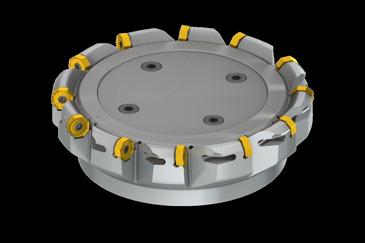 Face mill with double negative geometry which utilises 12 of ONMX 0605.., ONMX 0605..-W or SNMX 1705.. double-sided inserts, cutting diameter 200mm to maximum 210.8mm with 43° approach angle and 60mm connection bore according to DIN 8030-C, 63mm functional and, through coolant and differential pitch for face milling and chamfering with a maximum depth of cut of ON.. 4mm, SN.. 7mm