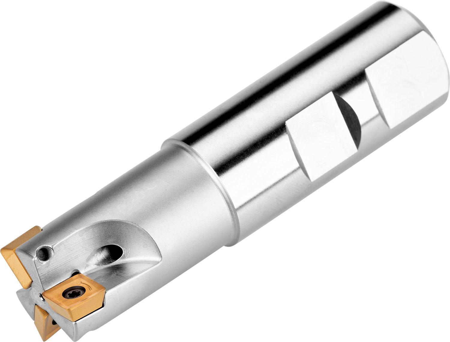 Shoulder mill with positve/negative geometry which utilises 2 of SOMT 09T3.. single-sided inserts, cutting diameter 20mm with 90° approach angle and 20mm Weldon shank according to DIN 1835B, 82mm overall length, through coolant for shallow shoulder milling, shallow slot milling and plunge milling with a maximum depth of cut of 8.0mm