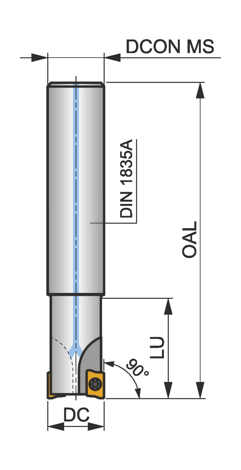 Shoulder mill with positve/negative geometry which utilises 4 of ADMX 0702.. or ADEX 0702.. single-sided inserts, cutting diameter 20mm with 90° approach angle and 18mm parallel shank according to DIN 1835A, 20mm functional and 200mm overall length, through coolant and differential pitch for shallow shoulder milling, shallow slot milling, ramping, helical milling, plunge milling and progressive plunge milling with a maximum depth of cut of 5.0mm