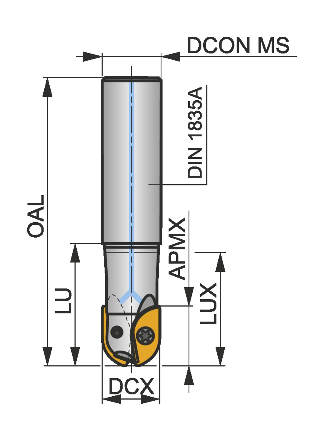 Copy end mill with double negative geometry which utilises 2 of ZP 20.. single-sided inserts, cutting diameter 20mm with 20mm parallel shank according to DIN 1835A, 50mm functional and 250mm overall length, through coolant for copy milling with a maximum depth of cut of 17,9mm