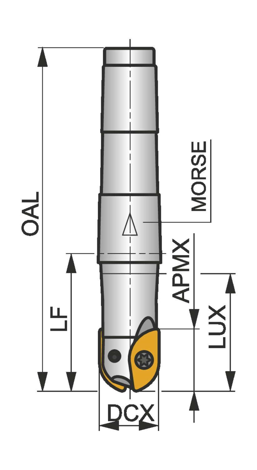 Copy end mill with double negative geometry which utilises 2 of ZP 20.. single-sided inserts, cutting diameter 20mm with MT 3 morse taper shank according to DIN 228-1A, 151mm overall length for copy milling with a maximum depth of cut of 17,9mm