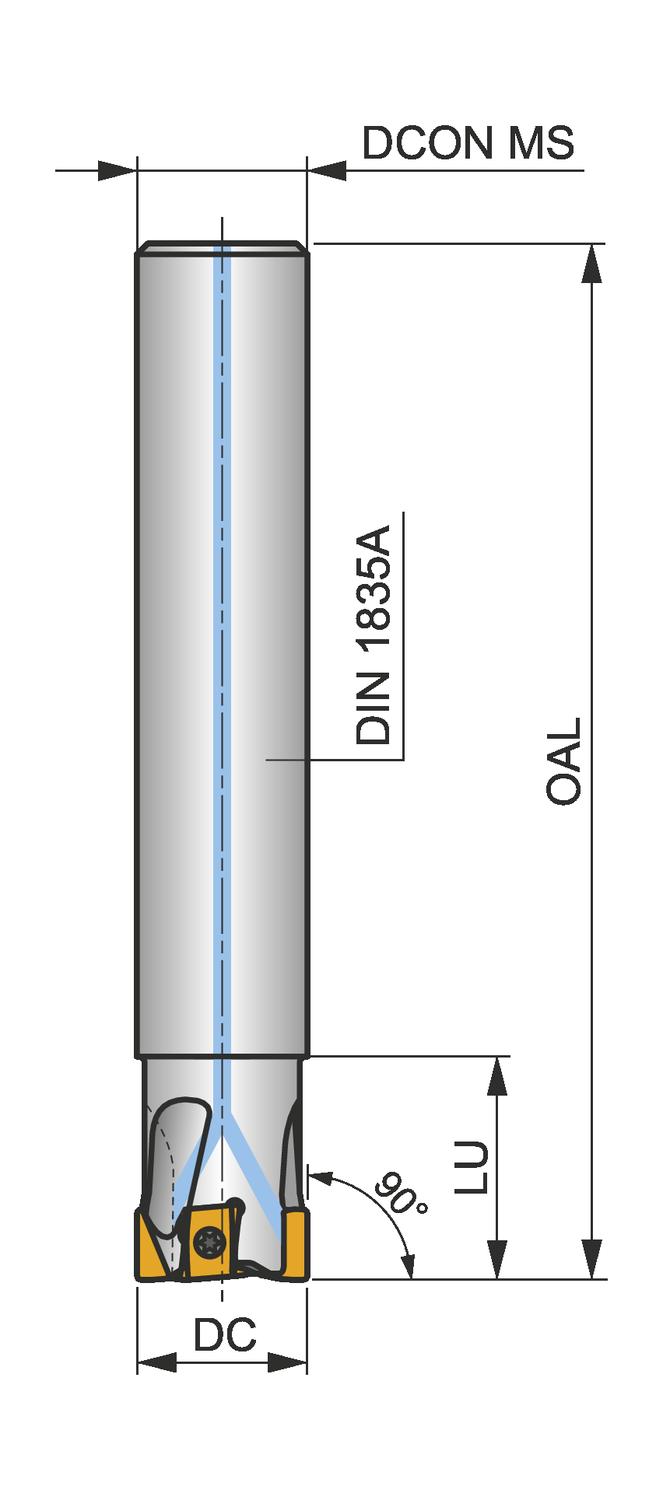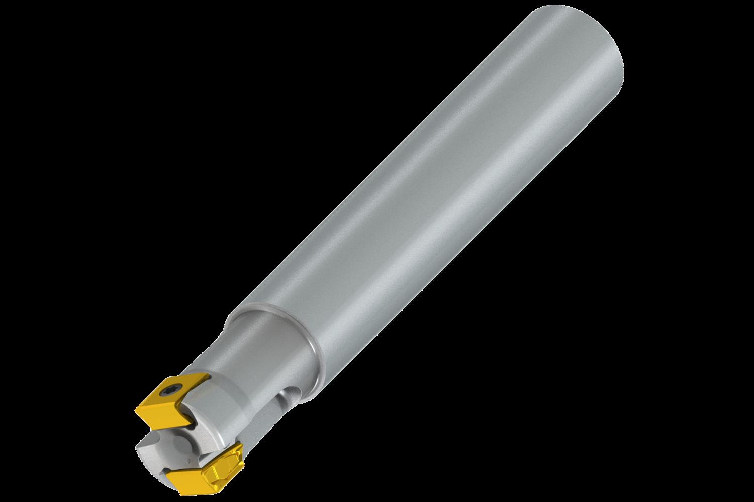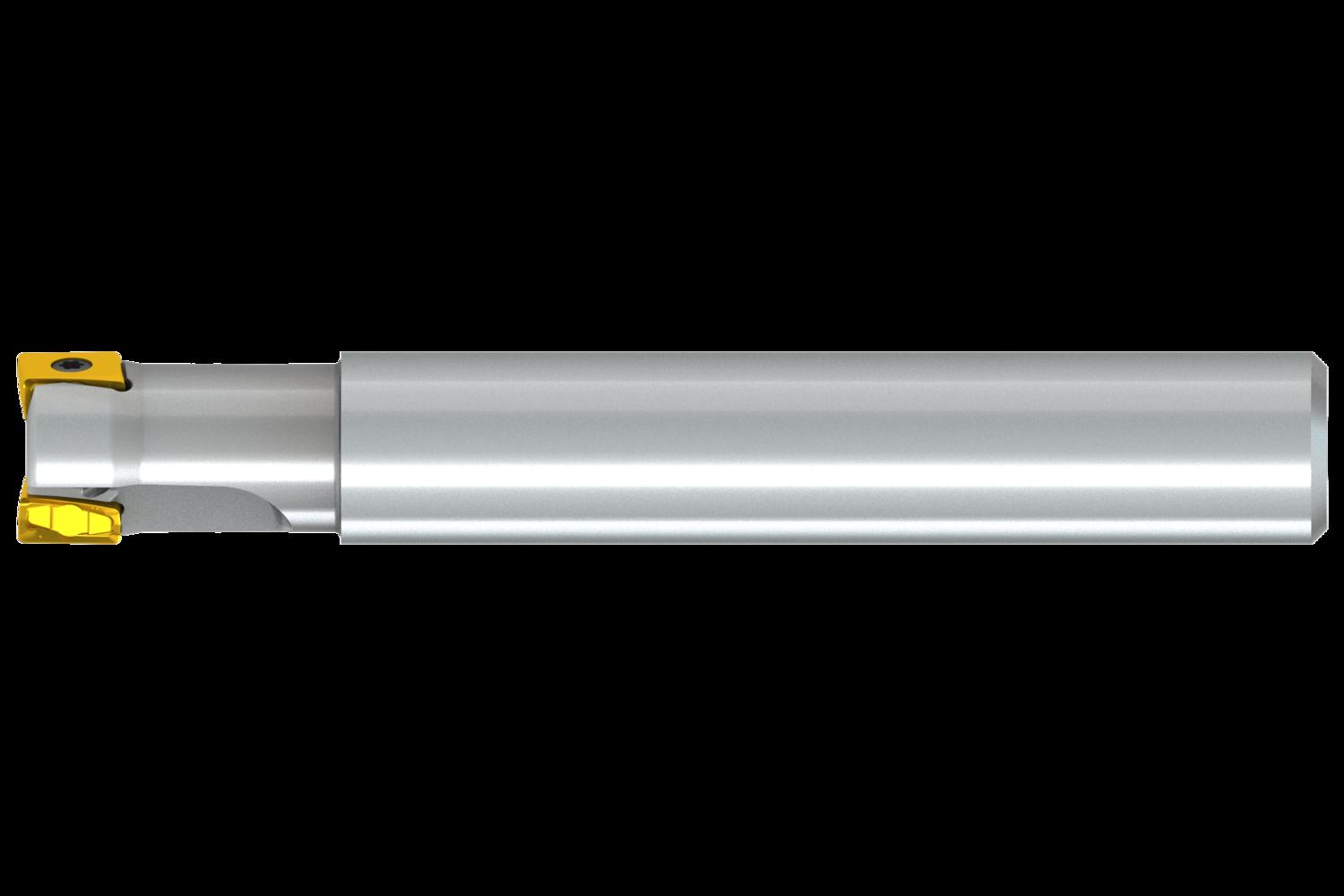 Shoulder mill with double negative geometry which utilises 2 of LNEX 1210.. double-sided inserts, cutting diameter 25mm with 90° approach angle and 25mm parallel shank according to DIN 1835A, 42mm usable and 170mm overall length, through coolant for face milling, shallow shoulder milling, deep shoulder milling, plunge milling and shallow slot milling with a maximum depth of cut of 10mm