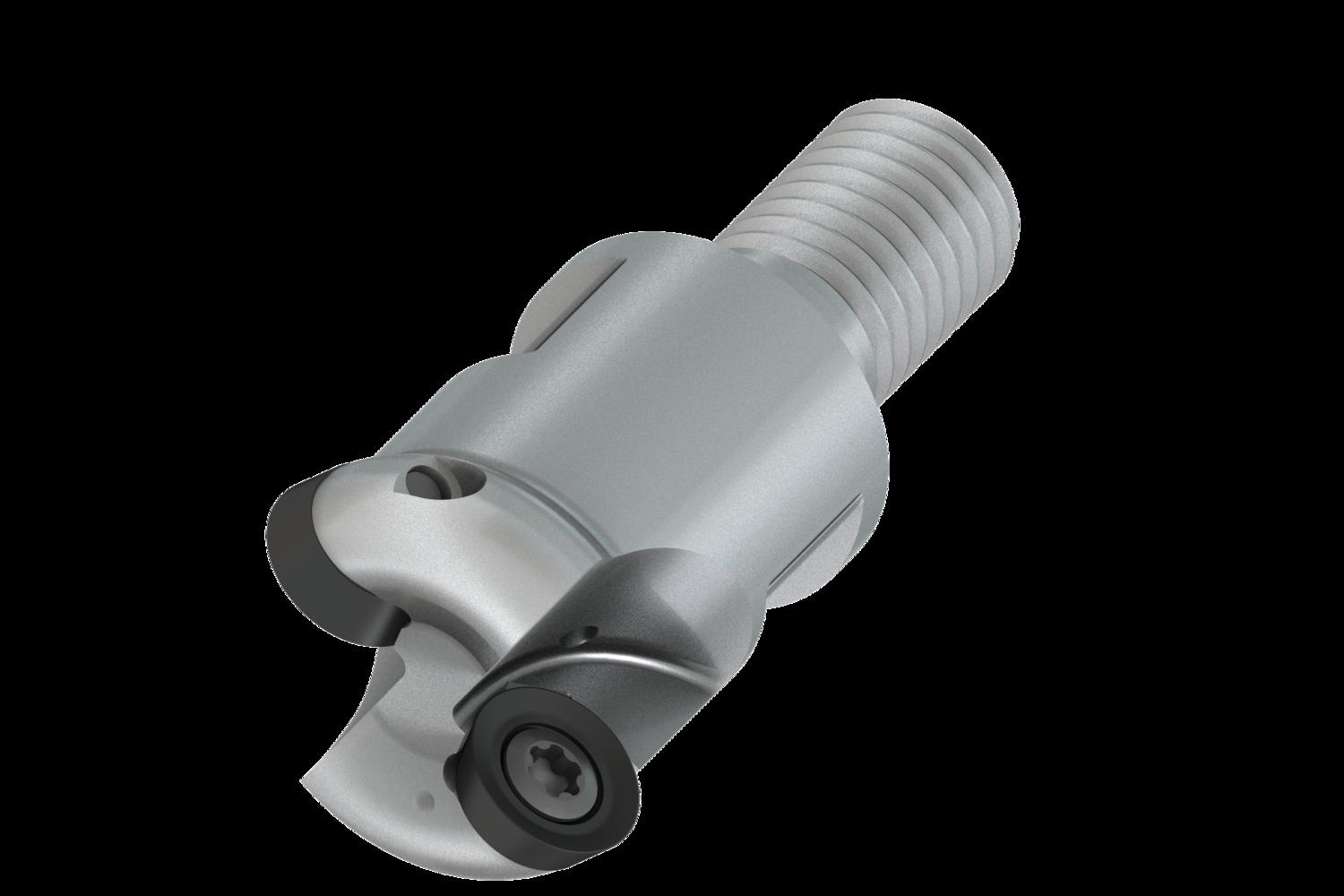Copy face mill with double positive geometry which utilises 2 of RD.. 1003MOT or RDHT 1003MO-FA single-sided inserts, cutting diameter to maximum 25mm with M12 threaded shank for standard modular tool-holders, 32mm functional and 54mm protrusion length, through coolant for face milling, copy milling, ramping, progressive plunge milling and helical milling with a maximum depth of cut of 2.5mm