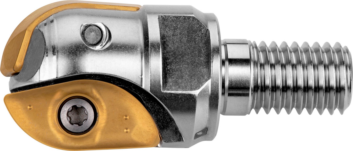 Copy end mill with double negative geometry which utilises 2 of ZP 25.. single-sided inserts, cutting diameter 25mm with M12 threaded shank for standard modular tool-holders, 35mm protrusion length, through coolant for copy milling with a maximum depth of cut of 22,3mm