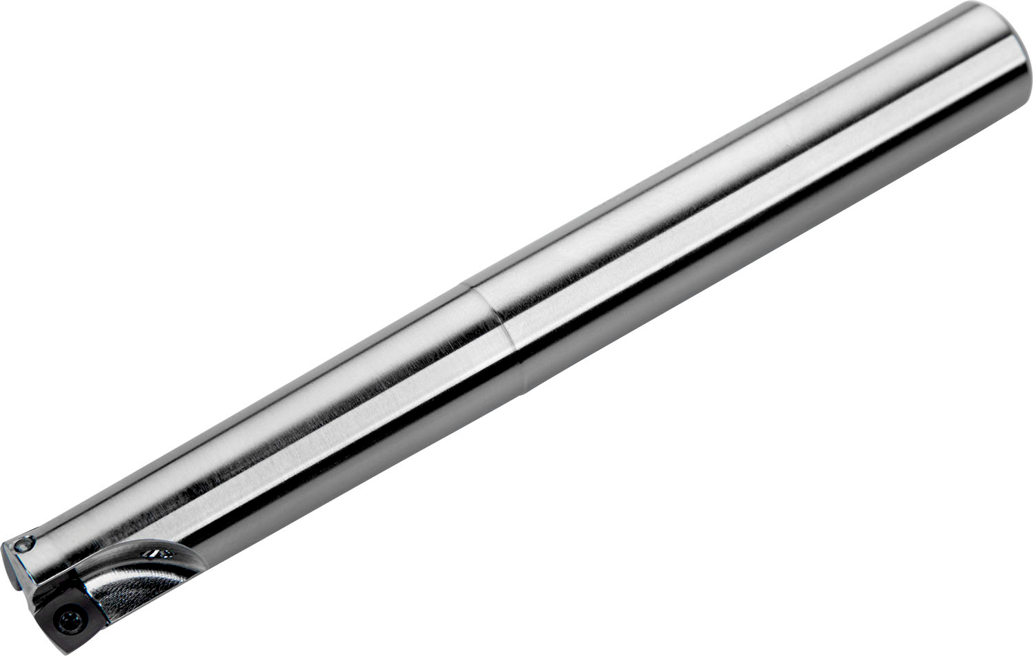 Face mill with positve/negative geometry which utilises 3 of SEET 09T3AF.. or SEMT 09T3AF.. single-sided inserts, cutting diameter 25 to maximum 34.8mm with 45° approach angle and 25mm Weldon shank according to DIN 1835B, 98mm overall length, through coolant for face milling and chamfering with a maximum depth of cut of 4.5mm