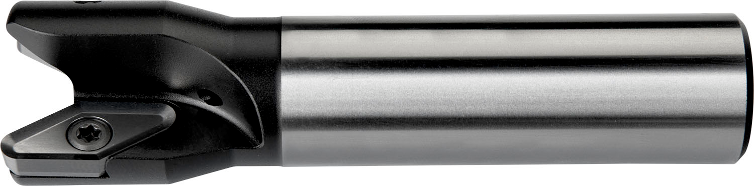 End mill with double positive geometry which utilises 2 of VCGT 220530F-FA single-sided inserts, cutting diameter 32mm with 90° approach angle and 25mm parallel shank according to DIN 1835A, 120mm overall length, through coolant for helical milling and progressive plunge milling with a maximum depth of cut of 3.0 (16.0)mm