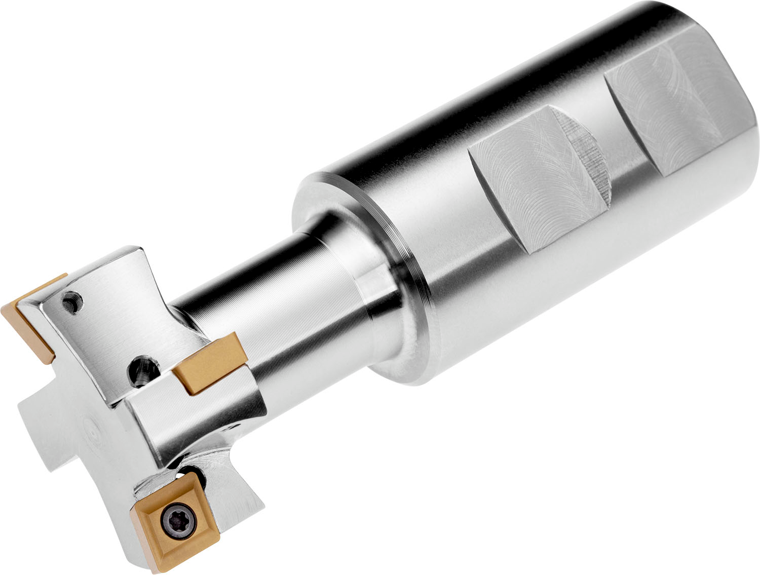 T-slot mill which utilises 2 of CCMX 08T308 single-sided inserts, cutting diameter 32mm with 90° approach angle and 32mm Weldon shank according to DIN 1835B, 98mm overall length, through coolant for T-Slot milling and rear face milling with a maximum depth of cut of 14mm
