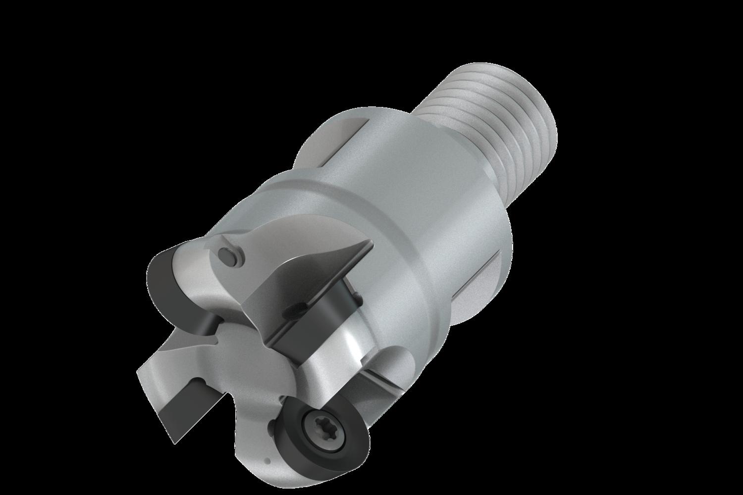 Copy face mill with double negative geometry which utilises 4 of RD.. 12T3MOT or RDHT 12T3MO-FA single-sided inserts, cutting diameter to maximum 35mm with M16 threaded shank for standard modular tool-holders, 42mm functional and 65mm protrusion length, through coolant for face milling, copy milling, ramping, progressive plunge milling and helical milling with a maximum depth of cut of 3mm