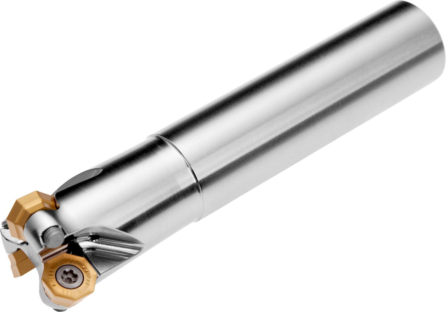 Copy face mill with positve/negative geometry which utilises 3 of OD.T 05IM, RD.T 12IM or SD.T 12IM single-sided inserts, cutting diameter 32.6mm with 45 / 90° approach angle and 32mm parallel shank according to DIN 1835A, 45mm functional and 150mm overall length, through coolant for face milling, copy milling, shallow shoulder milling, shallow slot milling, ramping, helical milling, plunge milling, progressive plunge milling and chamfering with a maximum depth of cut of 3.0 (6.0/10.0)mm