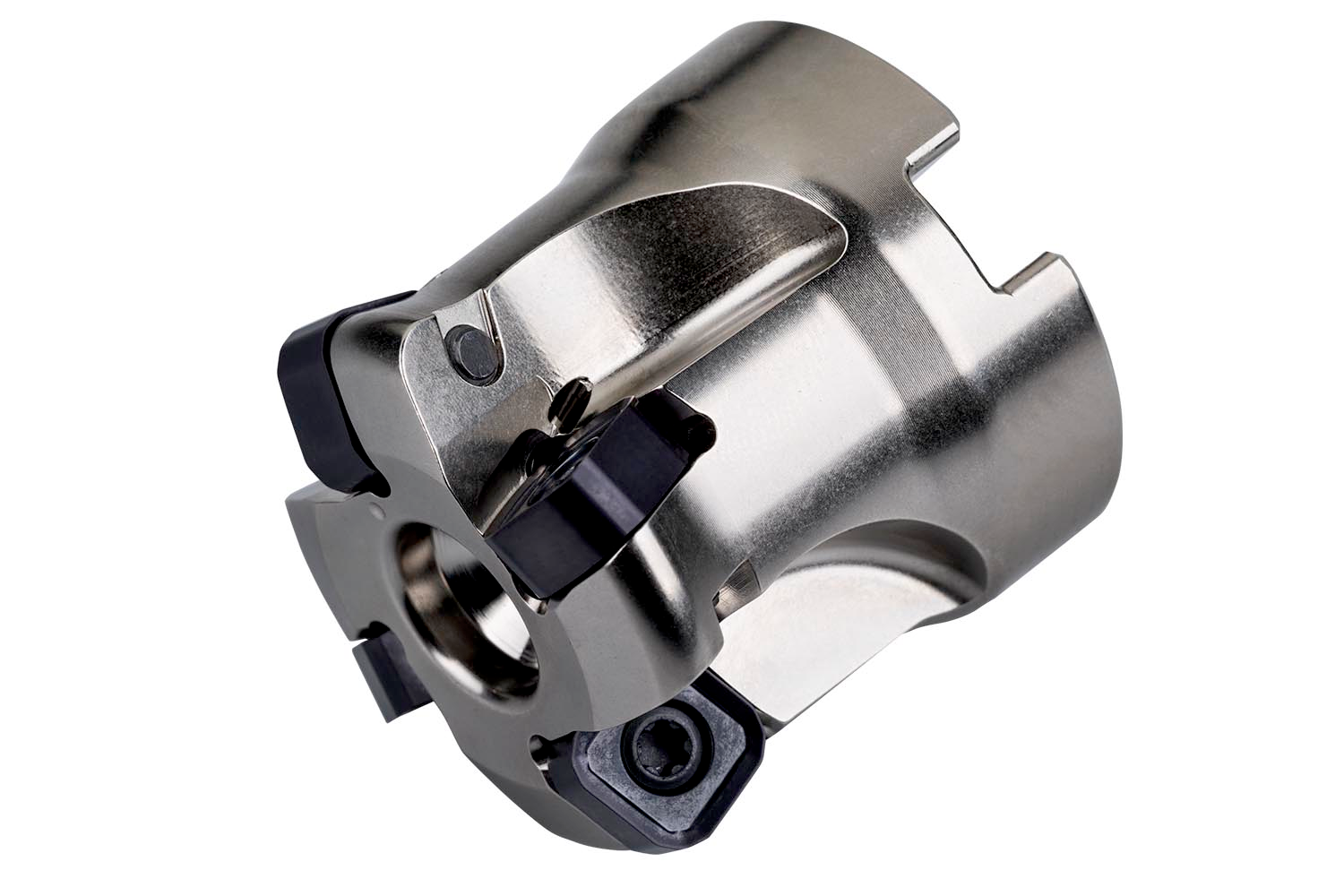 High feed cutter with double negative geometry which utilises 4 of SNGX 1104.. double-sided inserts, cutting diameter 42mm with 18° approach angle and 16mm connection bore according to DIN 8030-C, 40mm protrusion length, through coolant and differential pitch for face milling, copy milling, ramping, helical milling, plunge milling and progressive plunge milling with a maximum depth of cut of 1.7mm