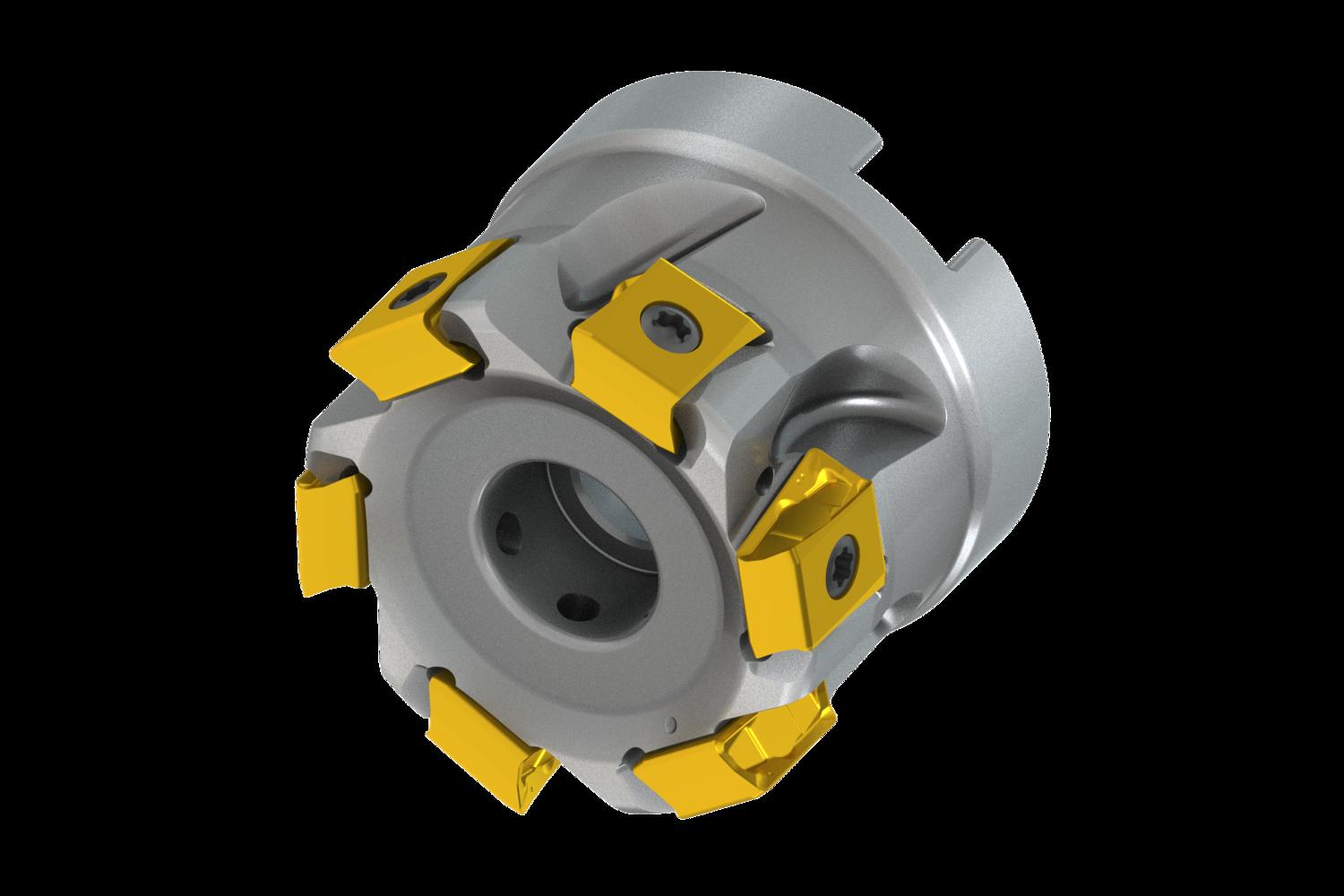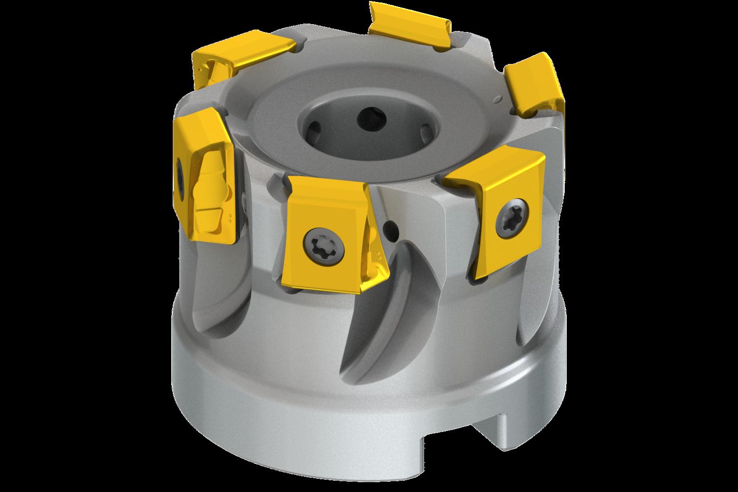 Shoulder mill with double negative geometry which utilises 6 of LNEX 1210.. double-sided inserts, cutting diameter 50mm with 90° approach angle and 22mm connection bore according to DIN 8030-A, 40mm functional and, through coolant for face milling, shallow shoulder milling, deep shoulder milling, plunge milling and shallow slot milling with a maximum depth of cut of 10mm
