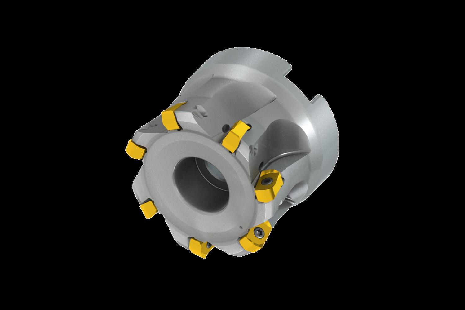 High feed cutter with double negative geometry which utilises 7 of BNGX 10T3.. inserts, cutting diameter 45mm to maximum 50mm with 29° approach angle and 22mm connection bore according to DIN 8030-A, 40mm functional and, through coolant and differential pitch for face milling, shallow shoulder milling, plunge milling, copy milling, ramping, progressive plunge milling and helical milling with a maximum depth of cut of 1mm