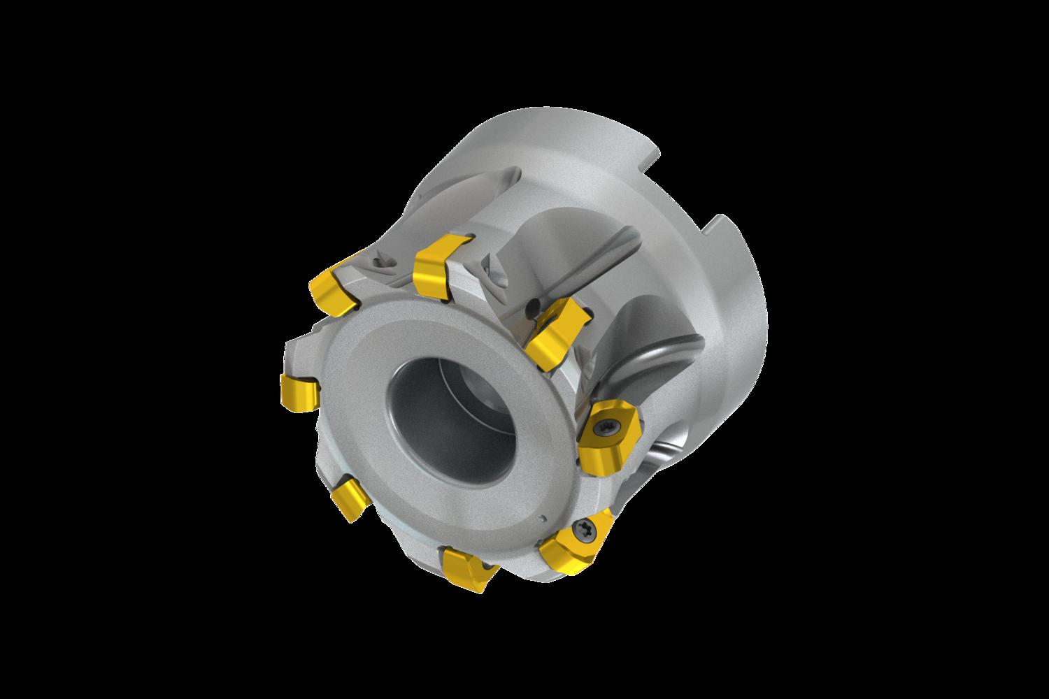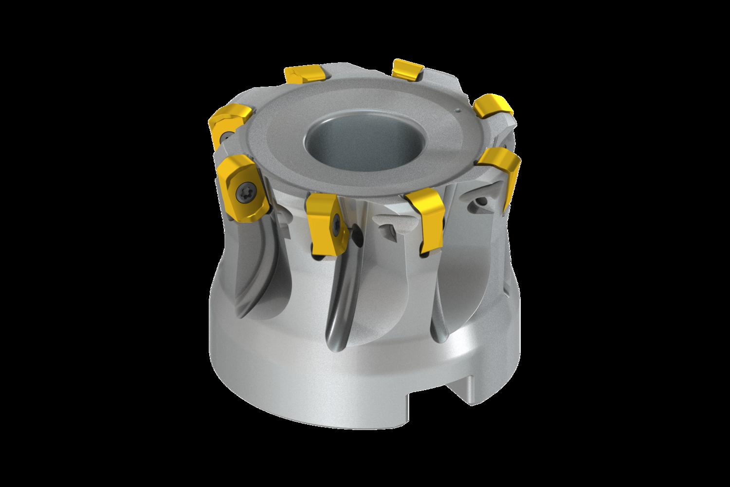 High feed cutter with double negative geometry which utilises 8 of BNGX 10T3.. inserts, cutting diameter 45mm to maximum 50mm with 29° approach angle and 22mm connection bore according to DIN 8030-A, 40mm functional and, through coolant and differential pitch for face milling, shallow shoulder milling, plunge milling, copy milling, ramping, progressive plunge milling and helical milling with a maximum depth of cut of 1mm