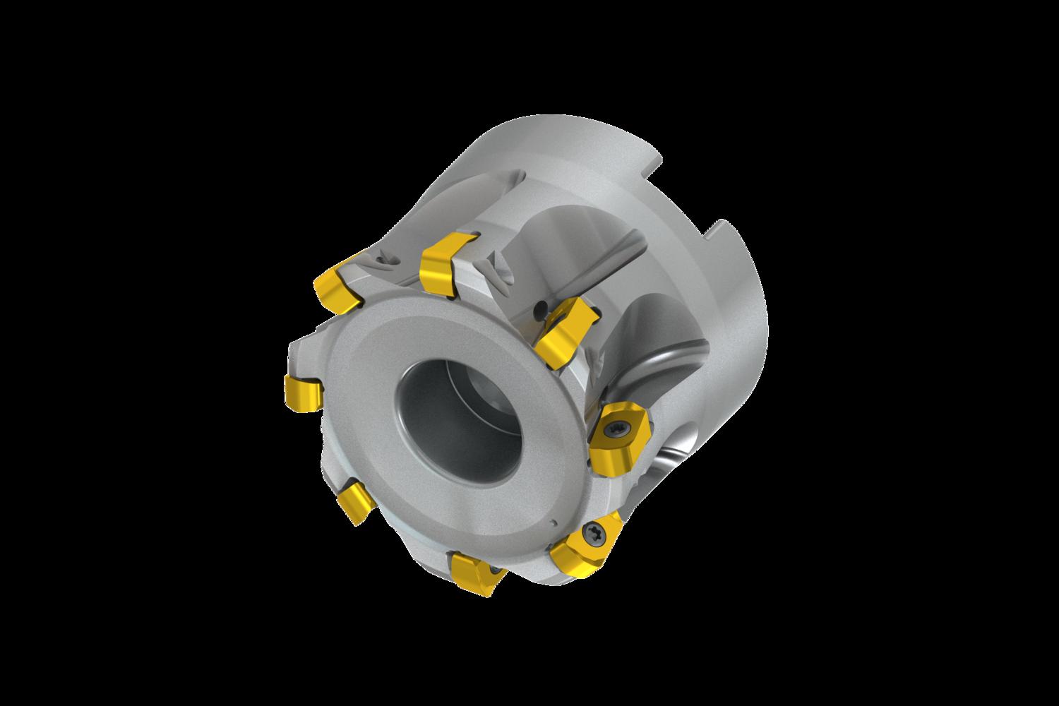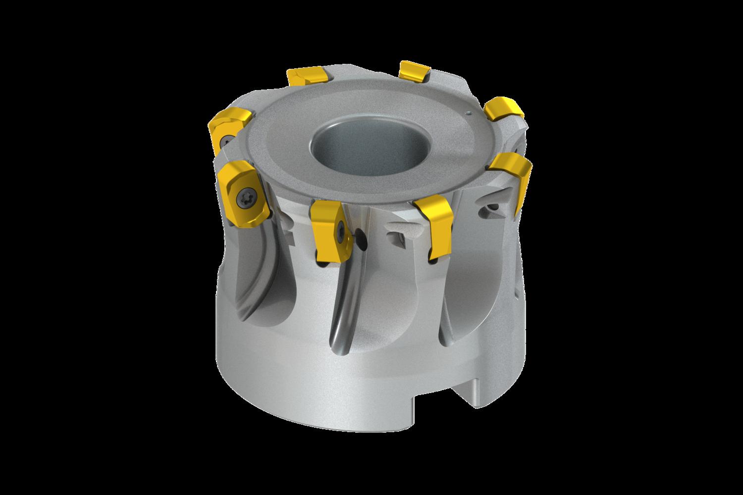 High feed cutter with double negative geometry which utilises 8 of BNGX 10T3.. inserts, cutting diameter 47mm to maximum 52mm with 29° approach angle and 22mm connection bore according to DIN 8030-A, 40mm functional and, through coolant and differential pitch for face milling, shallow shoulder milling, plunge milling, copy milling, ramping, progressive plunge milling and helical milling with a maximum depth of cut of 1mm