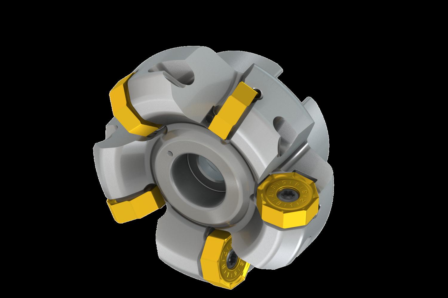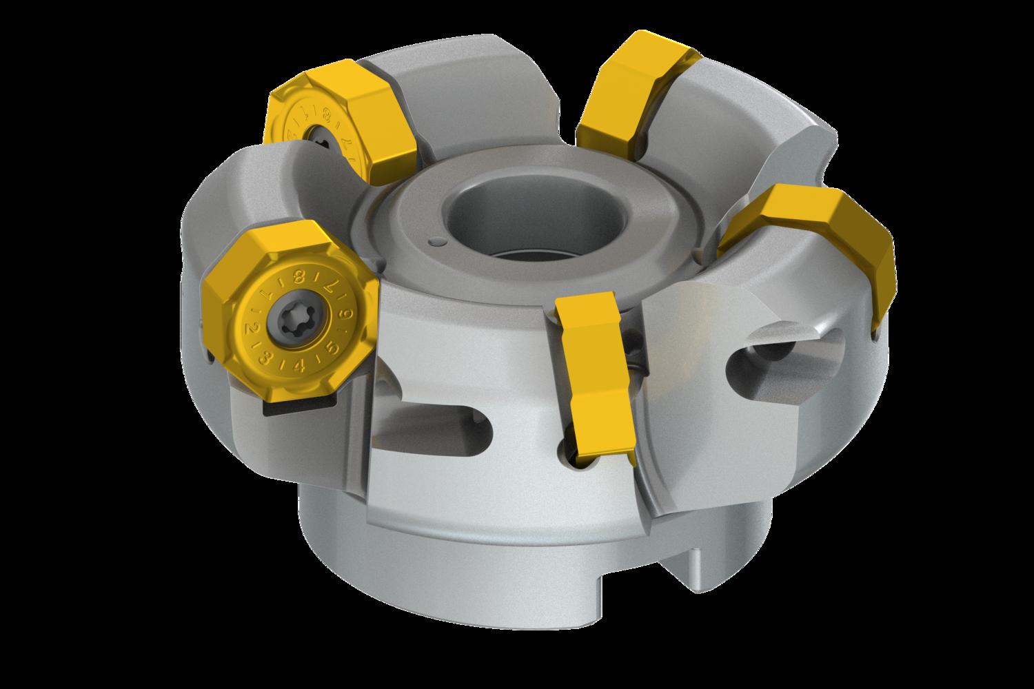 Face mill with double negative geometry which utilises 5 of ONMX 0605.., ONMX 0605..-W or SNMX 1705.. double-sided inserts, cutting diameter 63mm to maximum 73.8mm with 43° approach angle and 22mm connection bore according to DIN 8030-A, 40mm functional and, through coolant and differential pitch for face milling and chamfering with a maximum depth of cut of ON.. 4mm, SN.. 7mm