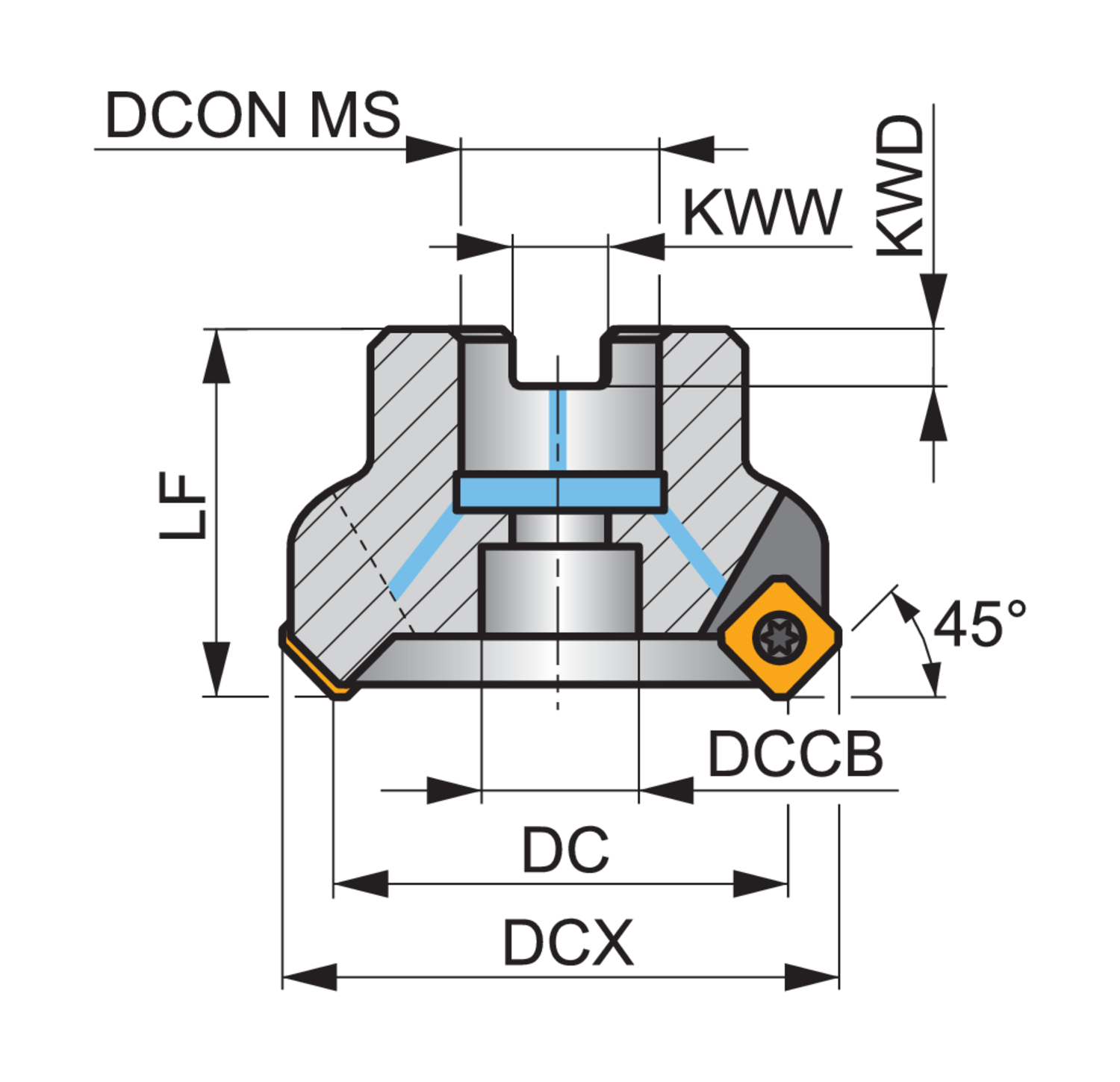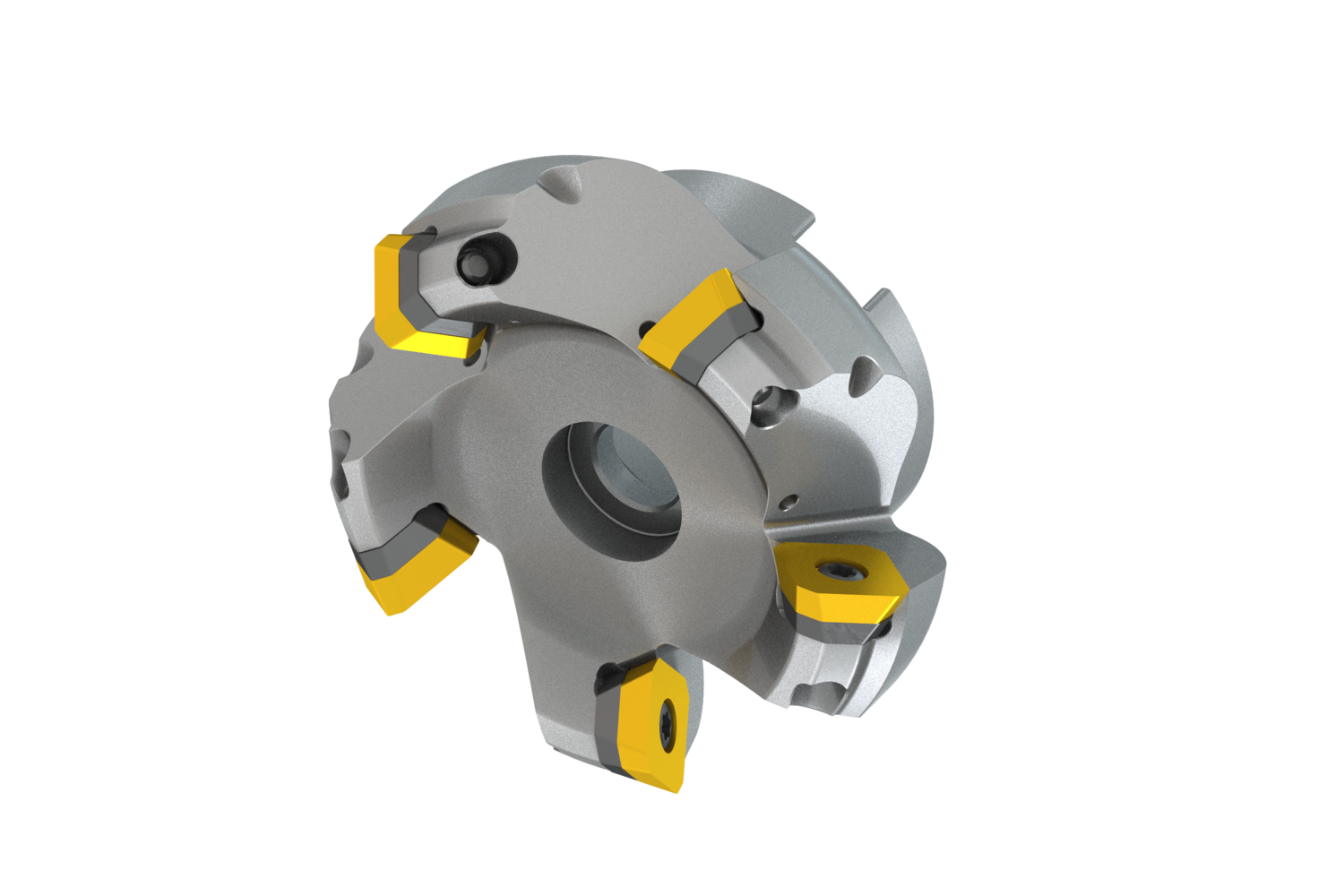 Face mill with positve/negative geometry which utilises 5 of SDET 13T3.., SDMT 13T3.. or XDET 13T3.. single-sided inserts, cutting diameter 63mm to maximum 76.4mm with 45° approach angle and 22mm connection bore according to DIN 8030-A, 40mm functional and, through coolant and differential pitch for face milling and chamfering with a maximum depth of cut of 6.4mm