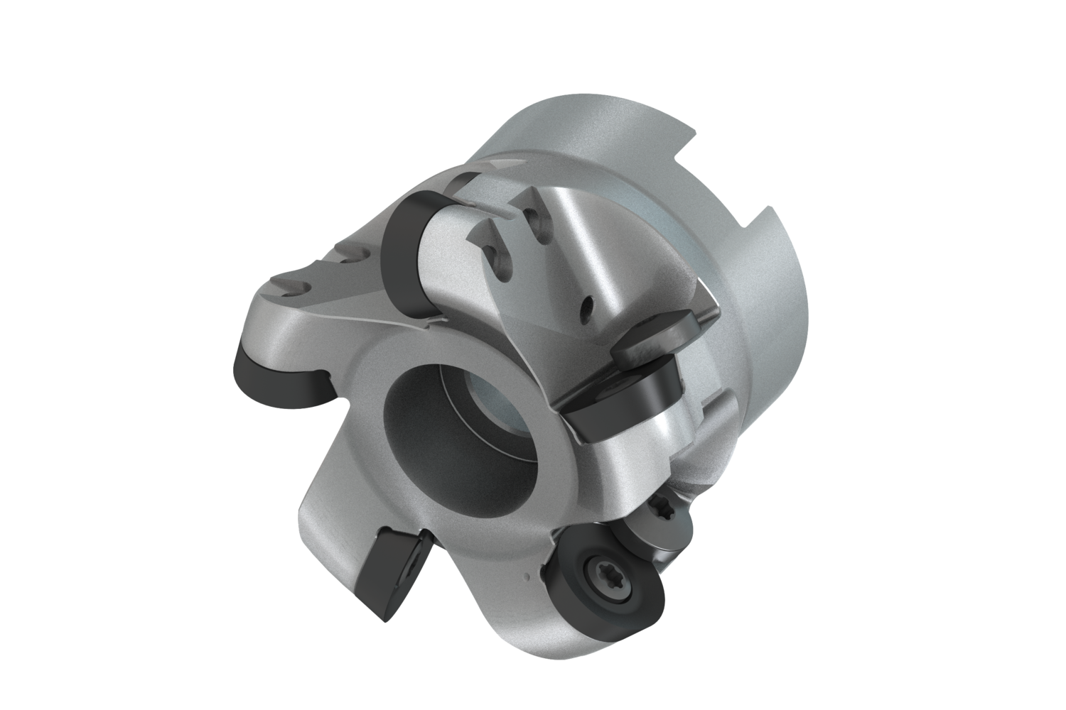 Copy face mill with positve/negative geometry which utilises 5 of RD.. 1604MOT or RDHT 1604MO-FA single-sided inserts, cutting diameter to maximum 66mm with 27mm connection bore according to DIN 8030-A, 50mm functional and, through coolant for face milling, copy milling, ramping, progressive plunge milling and helical milling with a maximum depth of cut of 4mm