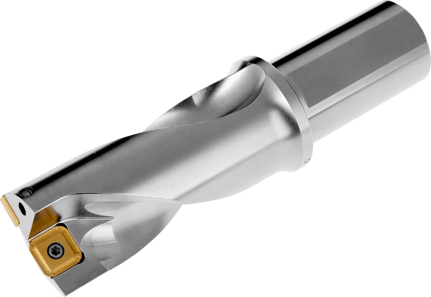 Indexable insert drill which utilises an XPET 11T3.. insert in the central pocket and a SCET 1204.. insert in the peripheral pocket, cutting diameter 1.437”, with a 1.500” cylindrical shank with flat according to ISO 9766 and through coolant for maximum drilling depths up to 2 x D