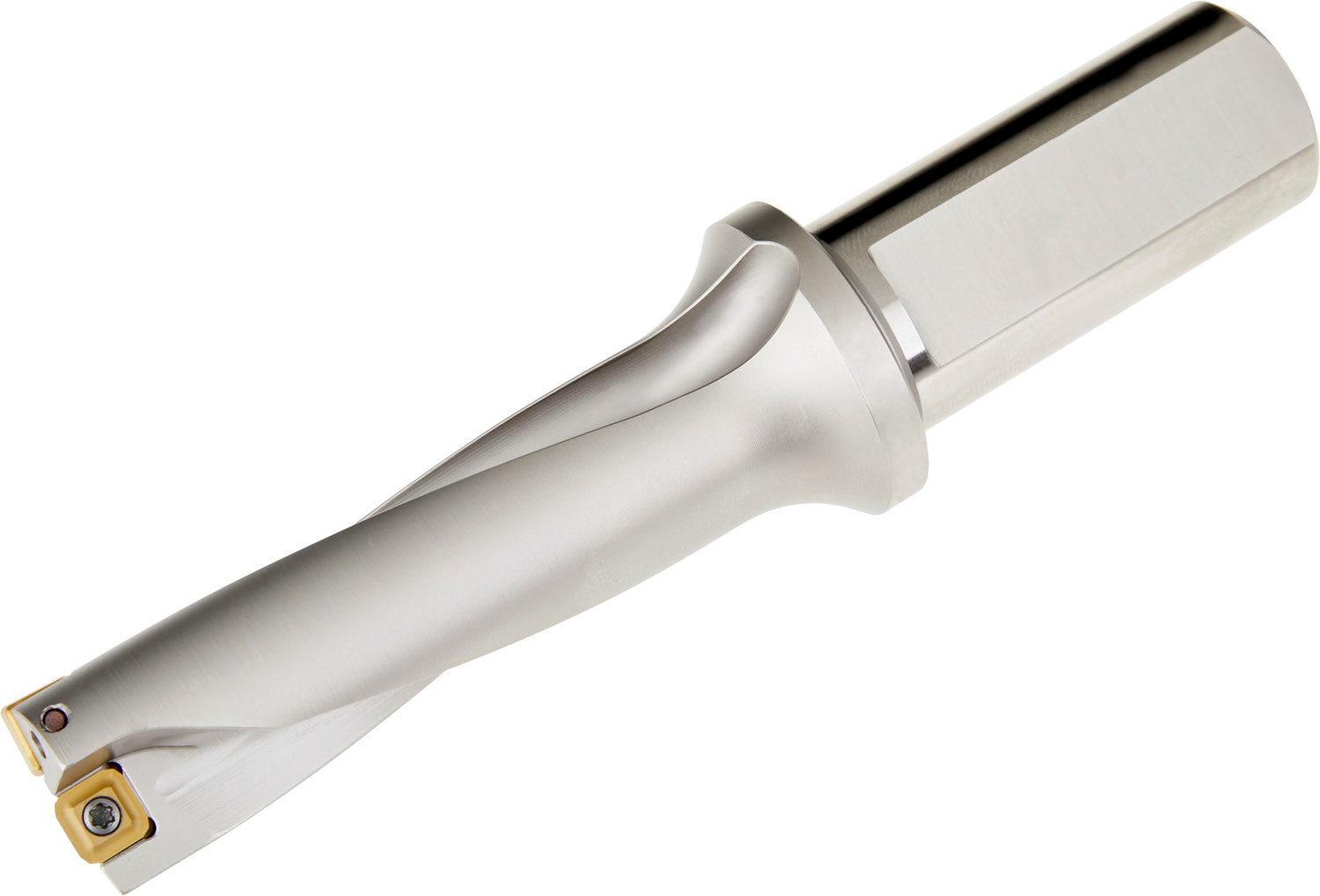Indexable insert drill which utilises an XPET 0703.. insert in the central pocket and a SCET 0703.. insert in the peripheral pocket, cutting diameter 24.5mm in combination with EP253253, suited for a radial adjustment of -0.10 to +0.50mm, with a 25mm cylindrical shank with flat according to ISO 9766 and through coolant for maximum drilling depths up to 3 x D