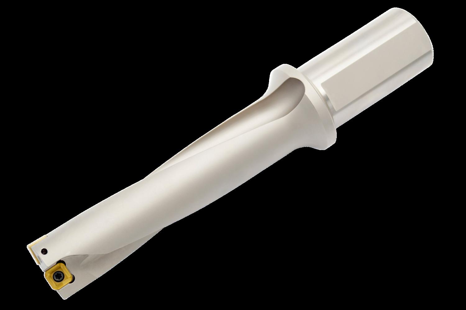 Indexable insert drill which utilises an XPET 0903.. insert in the central pocket and a SCET 09T3.. insert in the peripheral pocket, cutting diameter 1.109”, with a 1.250” cylindrical shank with flat according to ISO 9766 and through coolant for maximum drilling depths up to 4 x D