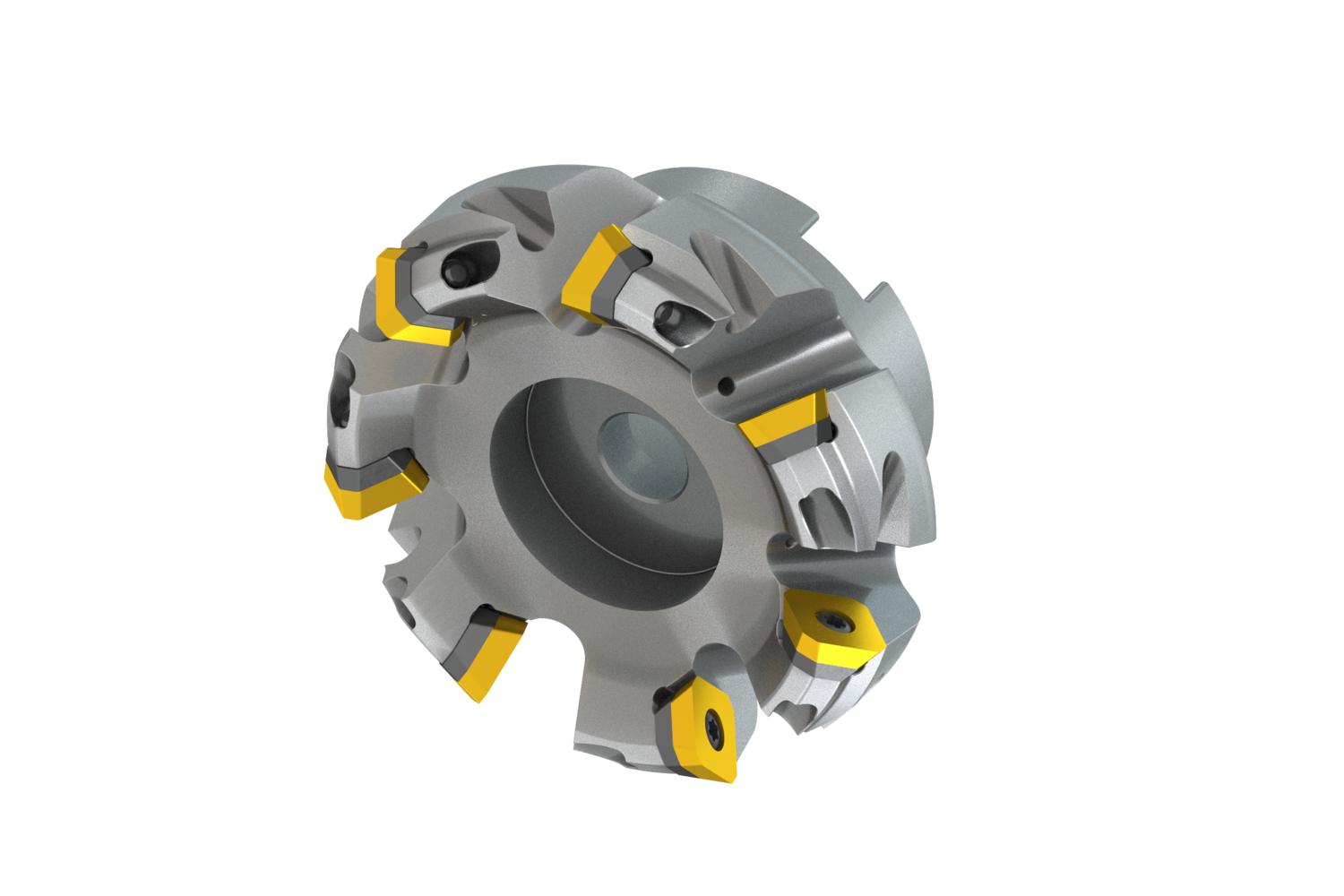 Face mill with positve/negative geometry which utilises 7 of SDET 13T3.., SDMT 13T3.. or XDET 13T3.. single-sided inserts, cutting diameter 80mm to maximum 93.4mm with 45° approach angle and 27mm connection bore according to DIN 8030-A, 50mm functional and, through coolant and differential pitch for face milling and chamfering with a maximum depth of cut of 6.4mm