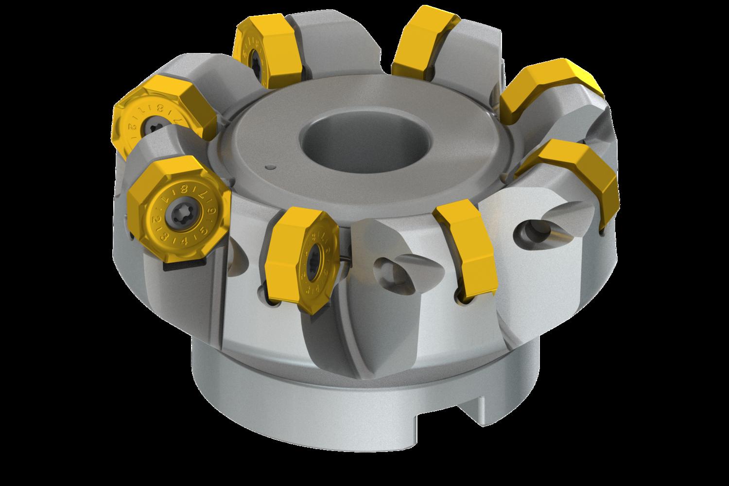 Face mill with double negative geometry which utilises 8 of ONMX 0605.., ONMX 0605..-W or SNMX 1705.. double-sided inserts, cutting diameter 80mm to maximum 90.8mm with 43° approach angle and 27mm connection bore according to DIN 8030-A, 50mm functional and, through coolant for face milling and chamfering with a maximum depth of cut of ON.. 4mm, SN.. 7mm