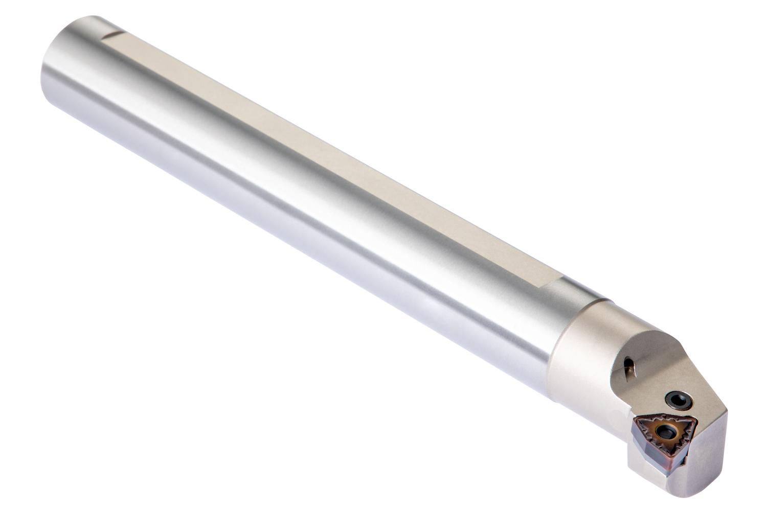 Lever lock boring bar for holding a 80° trigon negative insert with an inscribed circle diameter of 12.7mm, 4.76mm thick (ISO designation WN.. 0804.. ), left hand 95° side and end cutting with off-set shank, steel with coolant hole, 50mm diameter x 350mm long for taper boring and longitudinal boring with and without shoulder